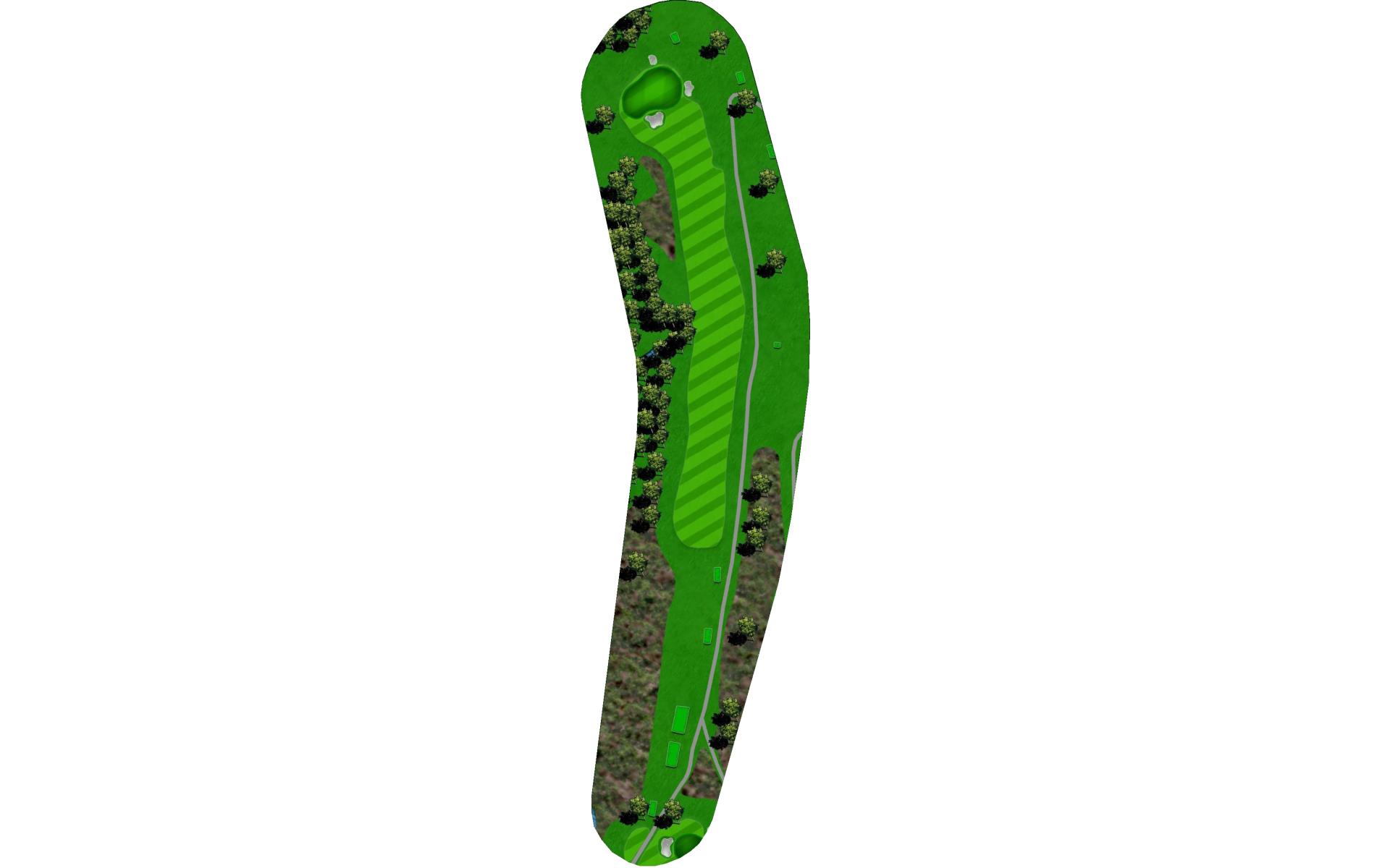 A creek runs along the left side from tee to green, and there is a pond hidden behind the bank of trees on the right. Long hitters can reach the pond off the tee. Those that hit the fairway have an easy approach to an unguarded green.